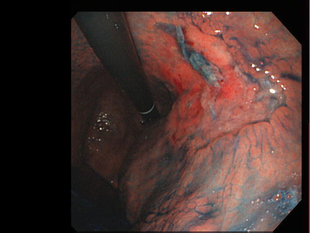 また、がんの組織形も治療法を決めるために重要です。組織の検査をして、その結果、高分化なものと未分化なものに分かれます。高分化のものは、かたまって発育していく性質がありますが、未分化のものは、パラバラとがん細胞が散らばっていくような発育をします。高分化なもののようにかたまって発育すれば、がんの範囲がわかりやすくて、内視鏡切除に適していますが。未分化なもののように、散らばって発育する場合は、がんの範囲がはっきりせず、予想以上に、広範囲に発育していたりします。このため、未分化がんは、内視鏡治療に不向きで、通常の外科手術が行われます。